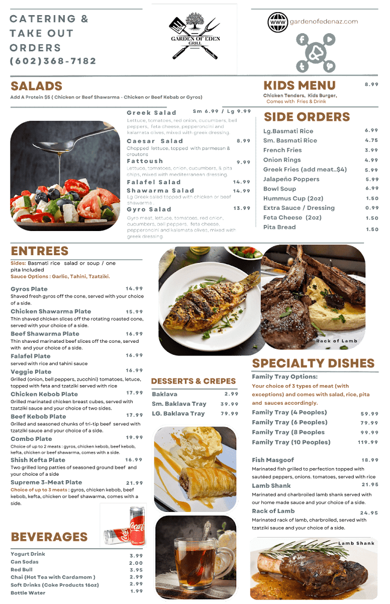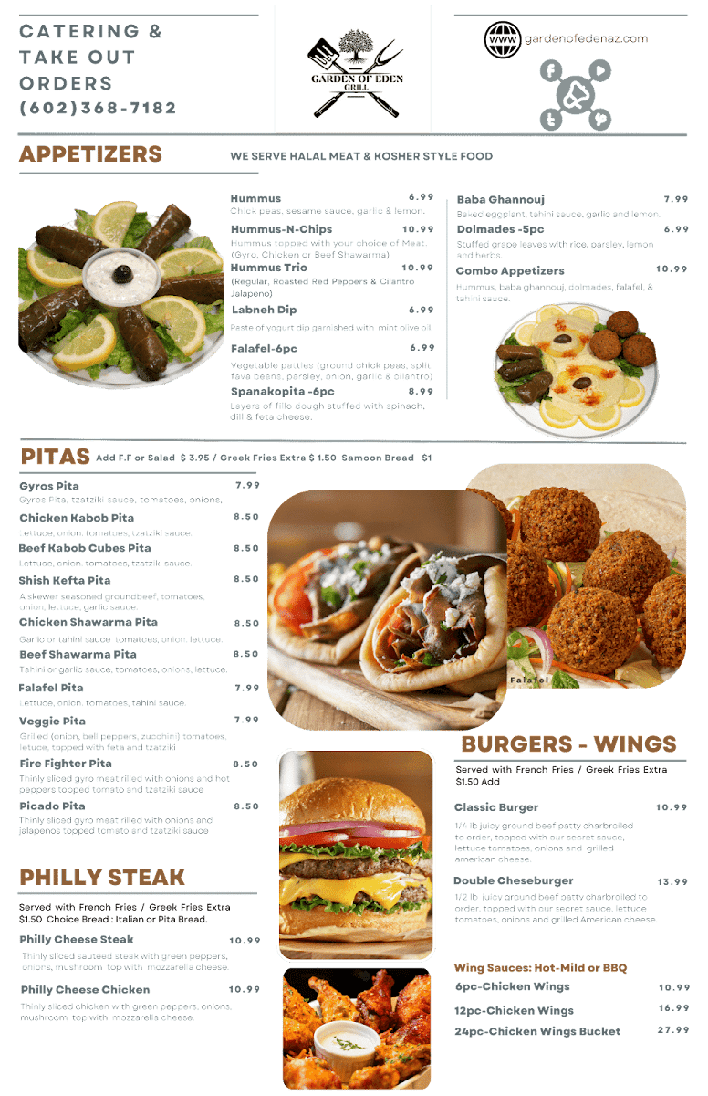 Nestled in the heart of Phoenix at 2505 E Bell Rd, Garden Of Eden Grill invites you to embark on a delightful culinary journey that promises to tantalize your taste buds. Our menu is a vibrant celebration of flavors, thoughtfully curated to offer you a taste of authentic Mediterranean cuisine. Among our specialties, the Baklava is a must-try, with its perfectly layered phyllo pastry and sweet, nutty filling that is sure to satisfy your sweet tooth. Don’t miss our Falafel Plate, a delightful ensemble of crispy falafel balls served with fresh vegetables and creamy hummus. For a hearty bite, the Chicken Shawarma Pita wraps tender, spiced chicken in a warm pita, perfect for lunch or dinner. We also offer Dolmas, delicately wrapped grape leaves filled with a savory mix of rice and herbs, as well as a mouthwatering Chicken Sandwich with a flavorful twist. Complement your meal with a crisp Caesar Salad, full of fresh greens and a sumptuous dressing. Join us at Garden Of Eden Grill, where every dish is crafted with love and served with a smile, making every visit a feast to remember. We can't wait to welcome you!